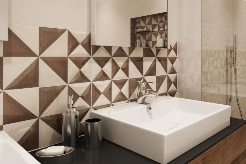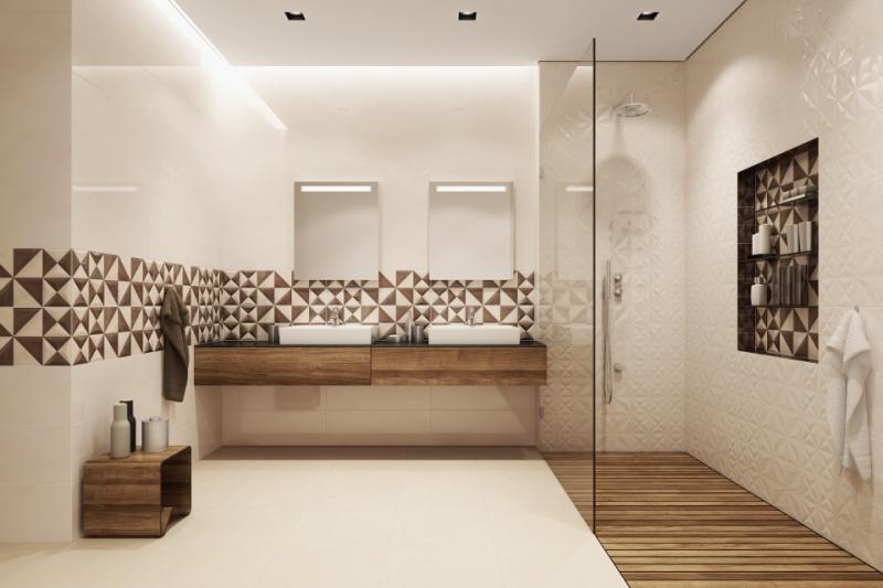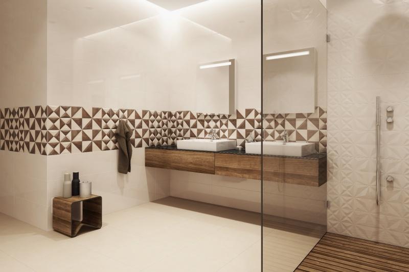 Tło to baza aranżacji, dlatego niezwykle ważny jest wybór okładzin na podłogę i ściany. Gładkie, błyszczące powierzchnie oraz jasna kolorystyka sprawdzą się w każdej łazience i jednocześnie optycznie ją powiększą. Zabiegiem, który pozwoli osiągnąć podobny efekt, a także nada pomieszczeniu wyjątkowego i bardzo nowoczesnego charakteru, jest wprowadzenie wrażenia płynności, ruchu oraz efektów 3D. To zadanie spełnią płytki strukturalne. Ich wypukłe wzory stanowią doskonałą alternatywę dla tradycyjnych ornamentalnych dekoracji. Wzór widoczny jest nie dzięki rysunkowi, ale światłu odbijającemu się od zróżnicowanej powierzchni. W zależności od oświetlenia (w łazience zwykle jest kilka źródeł światła) efekt na ścianie będzie się zmieniał. Na rynku dostępne są rozmaite kompozycje: od subtelnych pasów, przez falujące obłe kształty, po zdecydowane geometryczne struktury. Osiągnięcie wrażenia przestronności ułatwia także zastosowanie płytek wielkoformatowych. I choć ich ułożenie wymaga większej dokładności niż w przypadku standardowych rozwiązań, to wysiłek zrekompensuje wyjątkowo elegancki efekt. Wybierając glazurę czy gres o dużych wymiarach, warto dokładnie przemyśleć ułożenie elementów na ścianach i podłodze. Jeśli dobrze to rozplanujesz, niwelując do minimum liczbę przycinanych płytek, łazienka będzie robiła wrażenie większej.