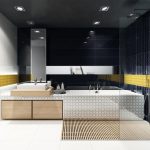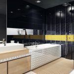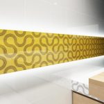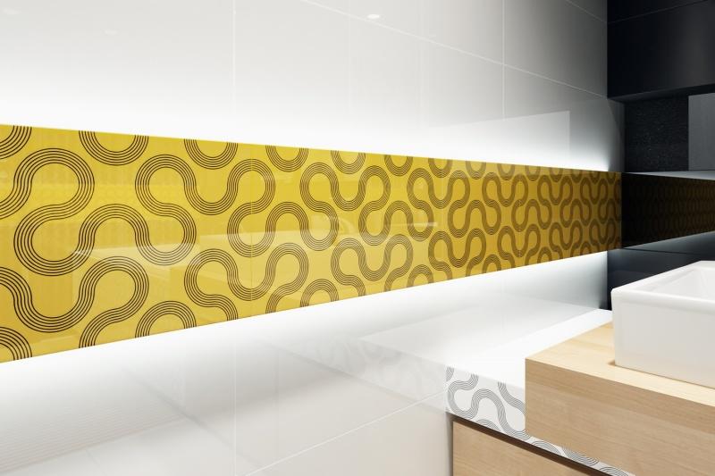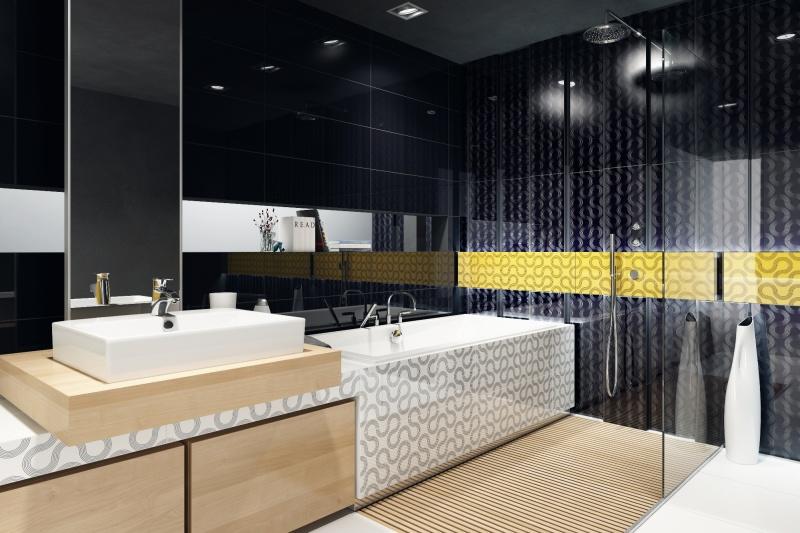 Kolekcję Spin tworzą płytki ścienne o wymiarach 25 x 75 cm, dostępne w czterech wersjach kolorystycznych. Delikatny wzór na białych elementach stanowi doskonałe tło dla wyrazistego czarnego motywu geometrycznego umieszczonego w centralnym punkcie łazienki.