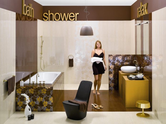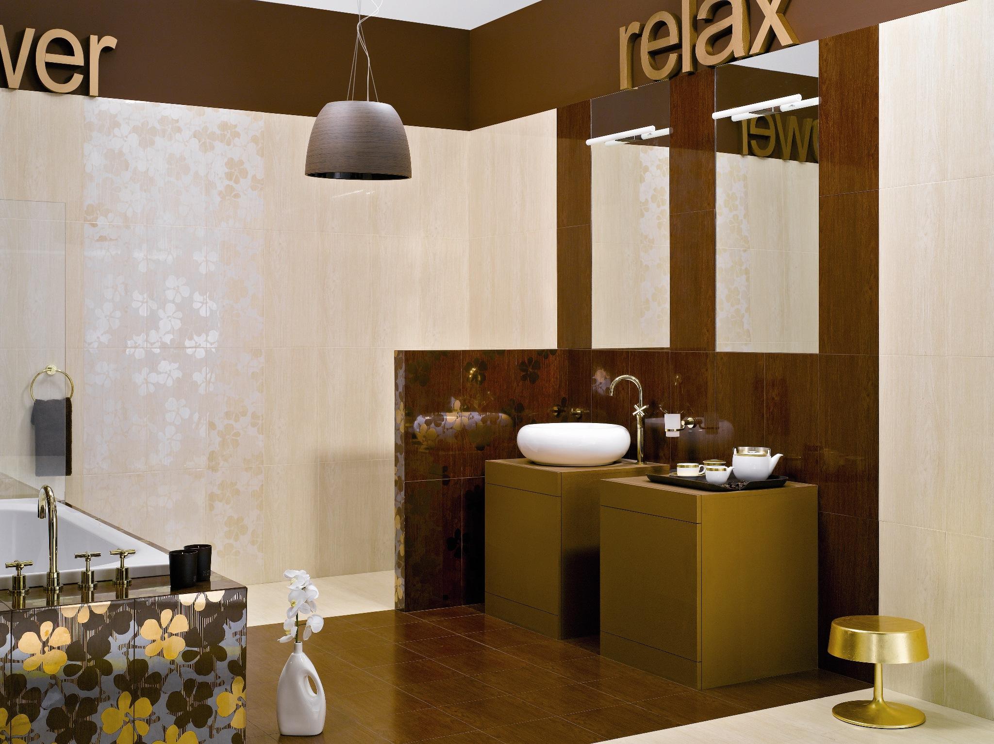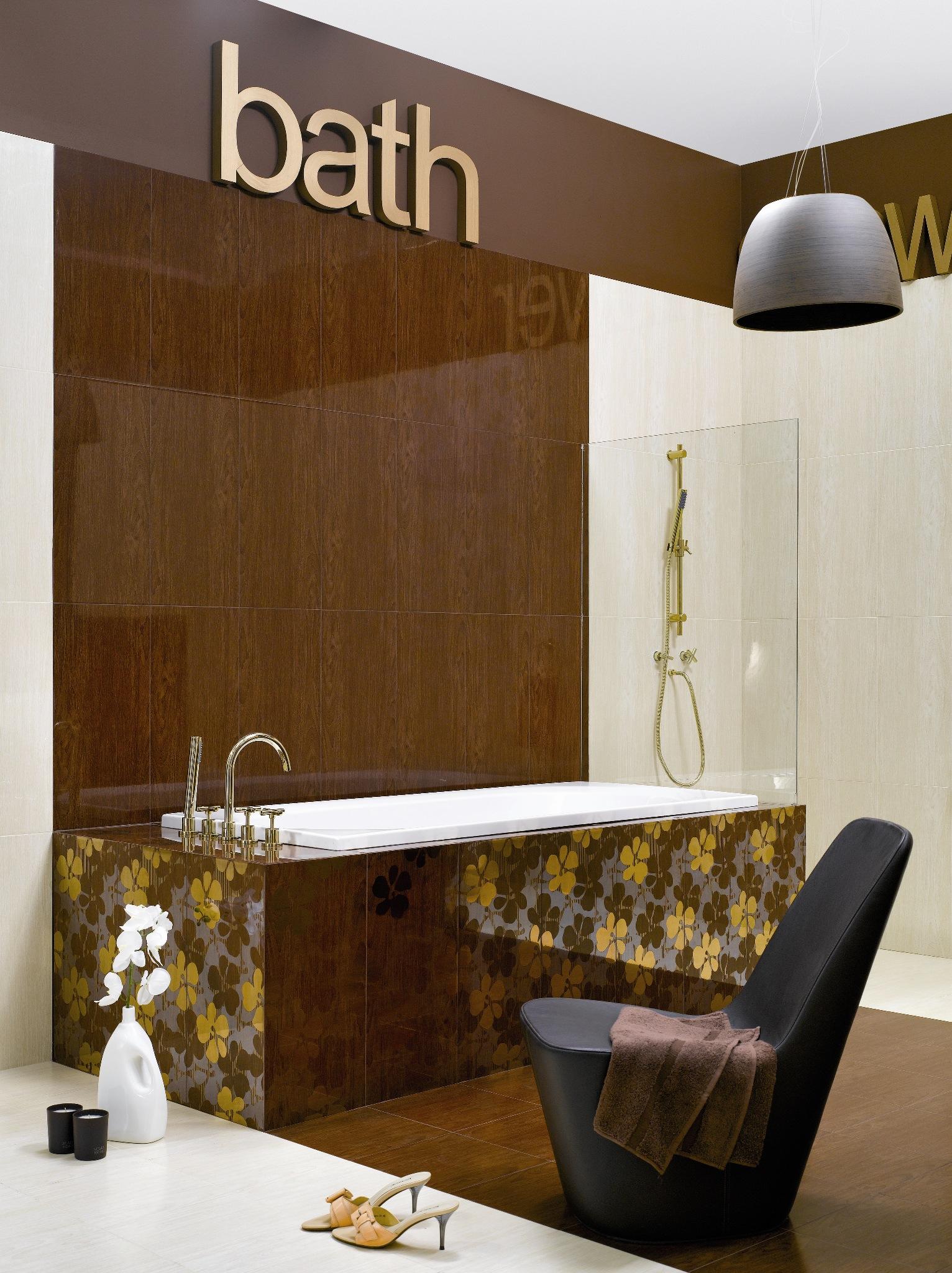 Smakowite barwy – głęboki, czekoladowy brąz i kremowe odcienie płytek imitujących drewno, z minimalistycznymi dodatkami i złotymi akcentami, zmienią zwyczajną łazienkę w prawdziwe domowe SPA. Wyrafinowane dekory inspirowane Krajem Kwitnącej Wiśni dodadzą aranżacji przytulności, a zarazem szczypty egzotyki.