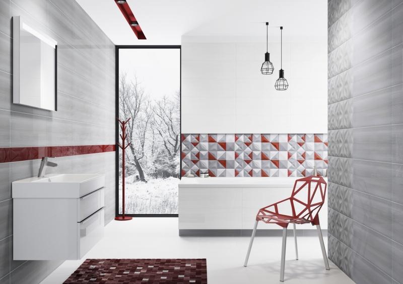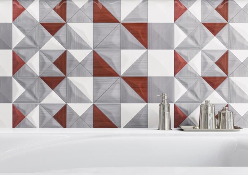 Stawiający na jasne wnętrza, przełamane nietuzinkowymi kolorami, mogą łączyć wspomniane już elementy z prostokątnymi, odpowiadającymi im płytkami strukturalnymi Delicate Lines Graphite Glossy Structure, delikatnymi Delicate Lines Graphite Glossy oraz z interesującą dekoracją uniwersalną Delicate Lines Multicolour Inserto Geo w formacie 25 x 75 cm, która łączy odcienie bieli, grafitu i czerwieni. Ciekawy insert Multicolour nawiązuje wzorem do form kubistycznych. Artyści tego nurtu, z Pablo Picasso na czele, przyglądali się przedmiotom przez pryzmat kształtu – np. trójkąta, starając się dotrzeć do samej natury przedmiotu. Mocne, wyraźne kolory skontrastowano tu z trójkątnymi kształtami, nadając pomieszczeniom eleganckiej prostoty, a jednocześnie artystycznej fantazji.