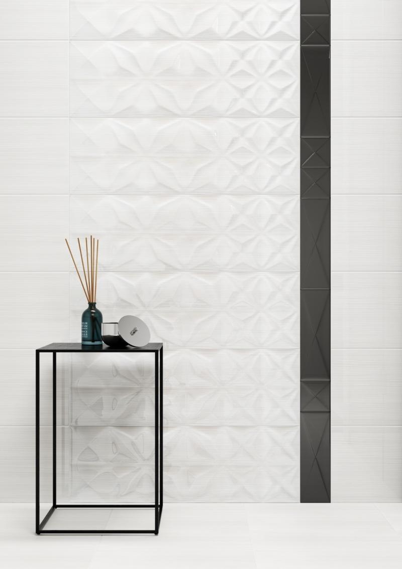 Podstawą kolekcji są prostokątne płytki Delicate Lines White Glossy i Delicate Lines White Glossy Structure w formacie 25×75 cm oraz kwadratowa płytka Delicate Lines White w formacie 42 x 42 cm.