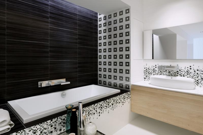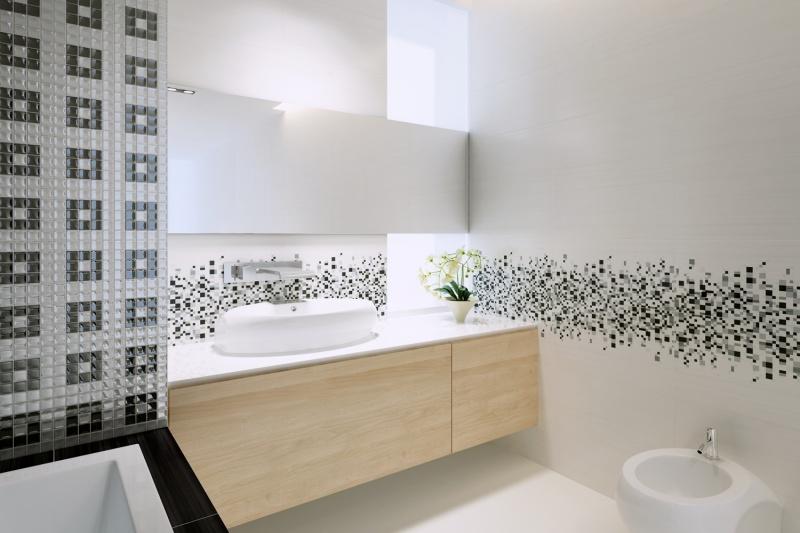 Sindi składa się z eleganckich płytek ściennych i podłogowych oraz szklanych mozaik. Satynowa płytka podłogowa, white satin, została wykonana w rozmiarze 42 x 42 cm, a błyszczące płytki ścienne (sindi white inserto geo oraz sindi white i sindi black) – w rozmiarze 29,7 x 60 cm. Płytki podstawowe charakteryzują się delikatnym, tonalnym wzorem linii, które optycznie powiększą łazienkę. Inserto natomiast ozdobione jest wyjątkowym geometrycznym wzorem czarnych – mniejszych i większych, jaśniejszych i ciemniejszych – kwadratów. Dekoracja zyskuje nowe oblicze dzięki zróżnicowanym zdobieniom nadającym lustrzane odbicia i świetliste refleksy – płytka została bowiem dodatkowo wzbogacona brokatem, niczym lustrzaną granilią. Trzy kompozycje czarno-białej szklanej mozaiki w formacie 14,8 x 14,8 cm oraz dekoracja szklana, glass black inserto, w formacie 9,9 x 29,7 cm stanowią ciekawe uzupełnienie płytek bazowych.