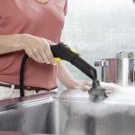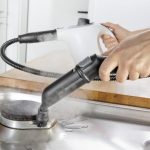 Mocno zabrudzoną powierzchnię płyty kuchennej należy najpierw solidnie namoczyć używając parownicy. Aby usunąć uporczywe plamy szczotkę pokrywamy specjalną nakładką do czyszczenia stali nierdzewnej. Ponieważ gorąca para działa jak coś w rodzaju smaru, nie ma ryzyka porysowania czyszczonej powierzchni.