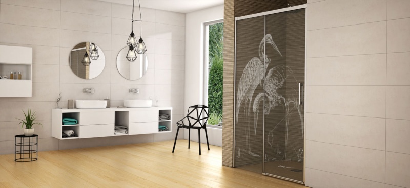 W łazience ciekawie prezentują się też naturalne materiały, takie jak drewno czy kamień. Królują one w stylu ekologicznym, w którym do aranżacji wykorzystuje się również rośliny, kwiaty i wszelkiego rodzaju akcesoria kojarzące się z naturą: naturalne gąbki, bambusowe dywaniki itp. By podkreślić styl ekologiczny można także wybrać kabinę prysznicową, na której wygrawerujemy motyw roślinny. Usługę laserowego grawerowania znajdziemy w ofercie Radaway. Wzór można wybrać z bazy firmy lub dostarczyć swój projekt – w przypadku stylu ekologicznego np. liści bananowca, drzewa itp. Wybierając usługę grawerowania nie musimy się martwić o jego trwałość. Grawer umieszczany jest zawsze na zewnętrznej stronie szyby, dzięki czemu hartowane szkło nie traci swoich właściwości i jest łatwe do utrzymania w czystości.