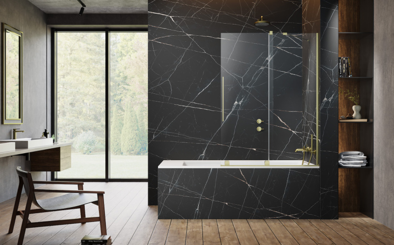 Parawan nawannowy bez problemu można dopasować do stylu każdej łazienki. Co więcej, za sprawą odpowiednio dobranego koloru detali może on podkreślić styl wnętrza. W ten sposób możemy sprawić, że będzie on pasował do armatury i w efekcie uzyskamy spójny, elegancki efekt. W ofercie Radaway znajdziemy aż dziewięć wariantów kolorystycznych. Od popularnego chromu, przez nowoczesną matową czerń i biel, po niezwykle modne i eleganckie szczotkowane odcienie metali. Wśród nich jest złoto, harmonizujące ze stylem kobiecym, mid-century modern lub nowoczesnym glamour; głęboka miedź świetnie komponująca się ze stylem retro czy loft; a także uniwersalny srebrzysty nikiel oraz tajemniczy gunmetal, przypominający spiż i pasujący doskonale do łazienki minimalistycznej czy rustykalnej. Jeżeli zależy nam na mocniejszym, zaskakującym efekcie dekoracyjnym, to zagwarantuje go parawan wyposażony w szkło z efektownym nadrukiem, który można zamówić w ramach programu „Na Miarę”. Możliwości jest wiele, od subtelnego motywu ramki czy szprosów po wzór w całości pokrywający taflę – roślinny, geometryczny albo abstrakcyjny. Dzięki temu praktyczny parawan nawannowy może stać się jednocześnie wspaniałą ozdobą wnętrza.