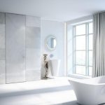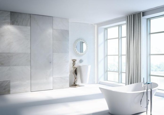 Kooperacja PIU Design i Laminam zaowocowała powstaniem zjawiskowych drzwi wysokich wykończonych jednym fragmentem płyty. System drzwi PIU Aluminium Design umożliwia bezpieczne zastosowanie na drzwiach spieków o grubości 3mm lub 5mm, nawet w ich maksymalnej wysokości tj. 300cm. Drzwi o rysunku i fakturze naturalnego kamienia to efektowne rozwiązanie nie tylko w łazienkach i pokojach kąpielowych ale również w salonie, holu czy gabinecie.