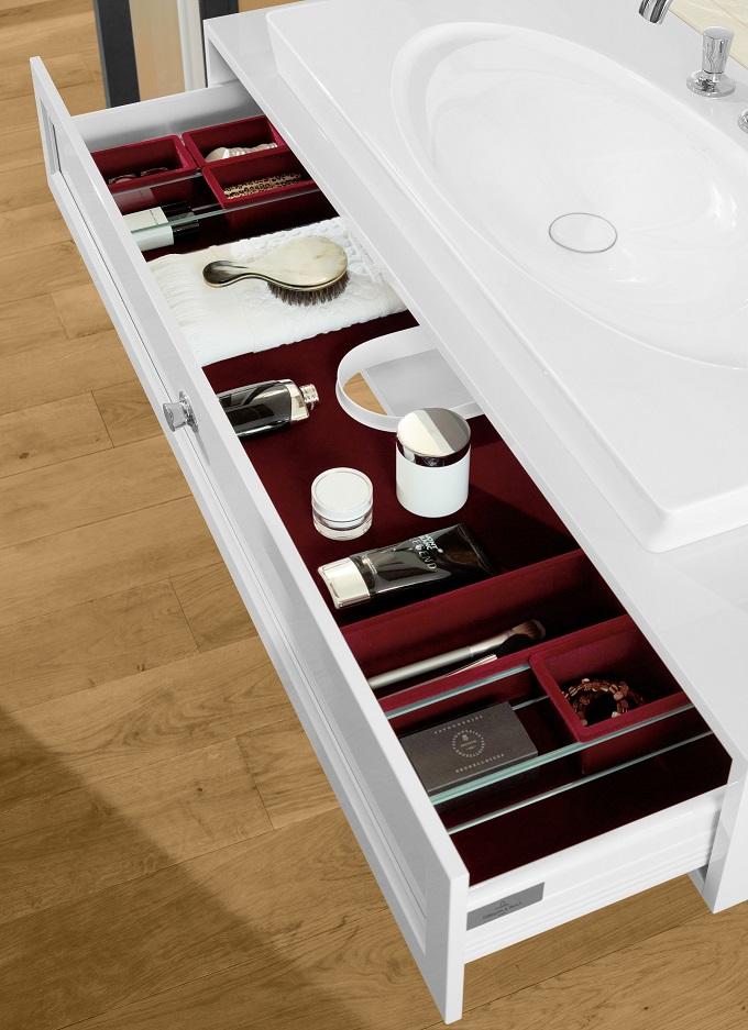 Uwagę zwracają obszerne wnętrza szafek La Belle, w których odpowiednie pojemniki i przeszklone ścianki pomagają w utrzymaniu porządku oraz kolorystyczne warianty kolekcji – ponadczasowa biel bajeczny i róż-malina.