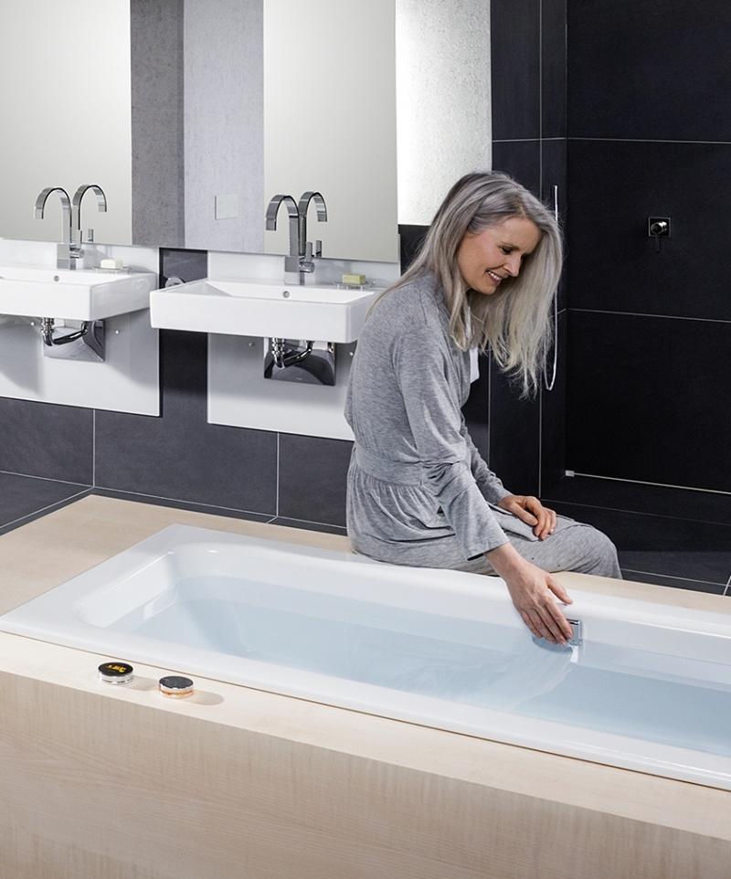 Na rynku dostępne są również przemyślane rozwiązania ułatwiające korzystanie z wanny. Należą do nich na przykład sterowane elektronicznie armatury Multiplex Trio E. Ich eleganckie moduły obsługi umożliwiają ustawienie temperatury i poziomu napełnienia wanny według indywidualnych preferencji. Wartości te można zapisać dla maksymalnie trzech osób i dzięki funkcji pamięci, aktywować je podczas kolejnych kąpieli.