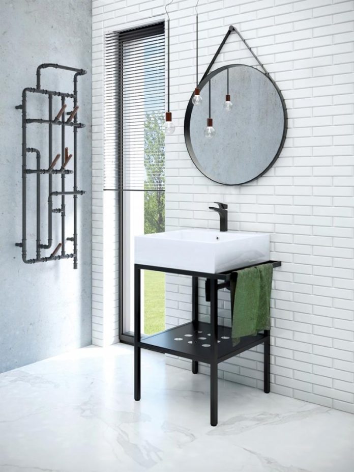 W połączeniu ze szkłem lub tworzywem sztucznym konsola umożliwi stworzenie aranżacji na wskroś nowoczesnej, a zestawiona ze starym drewnem da efekt retro. Dostępna w komplecie z prostą i funkcjonalną umywalką Temisto, będzie pasować do każdej łazienki. Zestaw dostępny jest w dwóch rozmiarach, a wysokość i poziomowanie można dostosować dzięki regulowanym nóżkom konsoli. Jest wyposażona w zintegrowany wieszak na ręcznik oraz demontowalną półkę stalową z otworami, które czerpią z estetyki konstrukcji stalowych. Wykończenie w kolorze czarnej satyny jest eleganckie i odporne na ścieranie. Konsola produkowana jest w całości w Polsce.