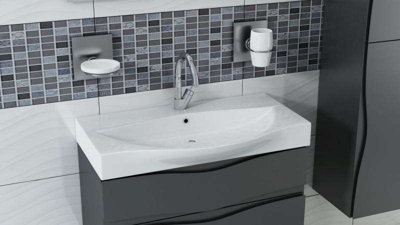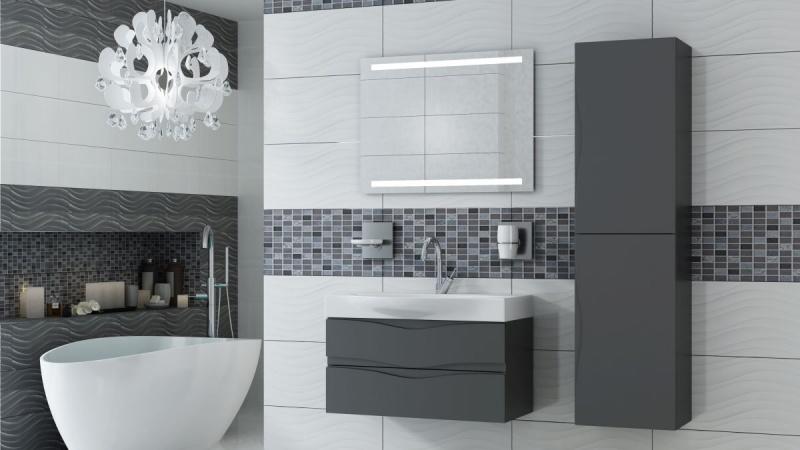 Meble Wave dostępne są w trzech atrakcyjnych wariantach kolorystycznych: biały połysk, szary mat i grafit mat. W celu kolorystycznej spójności wnętrza szafek w kolorze szarym również utrzymano w szarościach. Szuflady z systemem cichego domykania i zawiasy z samodociągiem w drzwiczkach szafek podnoszą komfort użytkowania mebli. Zestaw Wave można wzbogacić o podświetlane lustro LED z oferty Antado.