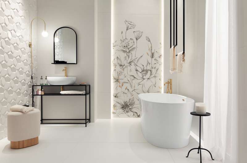 Velo Bianco to nowa kolekcja marki Domino, w której spotykają się piękno, przyroda i wrażliwość artysty. Płytki z motywem kwiatowym przywodzą na myśl delikatne muśnięcia cieniutkim piórem do kaligrafii, a nieregularna, biała mozaika przełamuje naturalistyczny obraz rysem nowoczesności. Wszystko to spojone zostało zalotnie połyskującymi złotymi detalami.