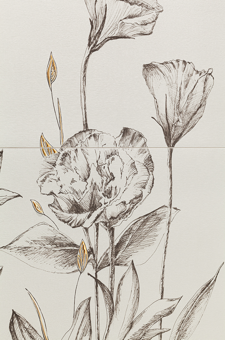Kolekcja Velo Bianco to płytki utrzymane w łagodnej, sprzyjającej wyciszeniu kolorystyce. Ciepła biel stała się wdzięcznym płótnem dla finezyjnych, botanicznych obrazów. Są to odręczne szkice projektantki Joanny Nowak. Inspiracją do ich stworzenia stały się niezwykłe kwiaty – eustoma, lilia i lotos. Wierzchnią warstwę pokryto granillą subtelnie podkreślającą liście oraz złoto.