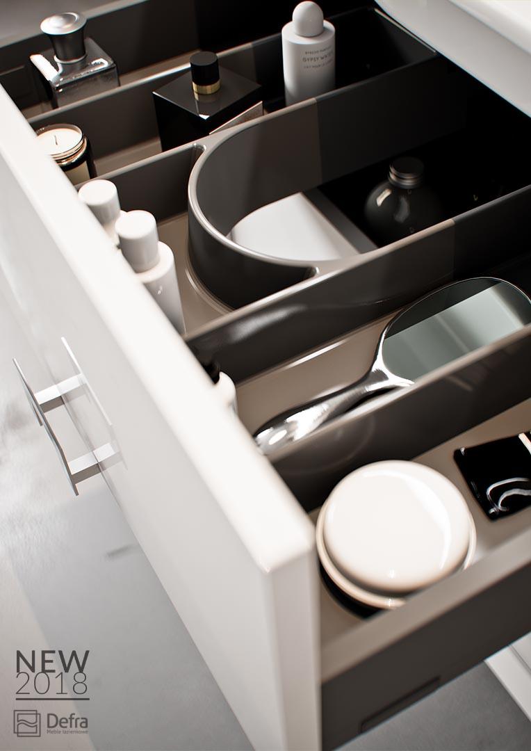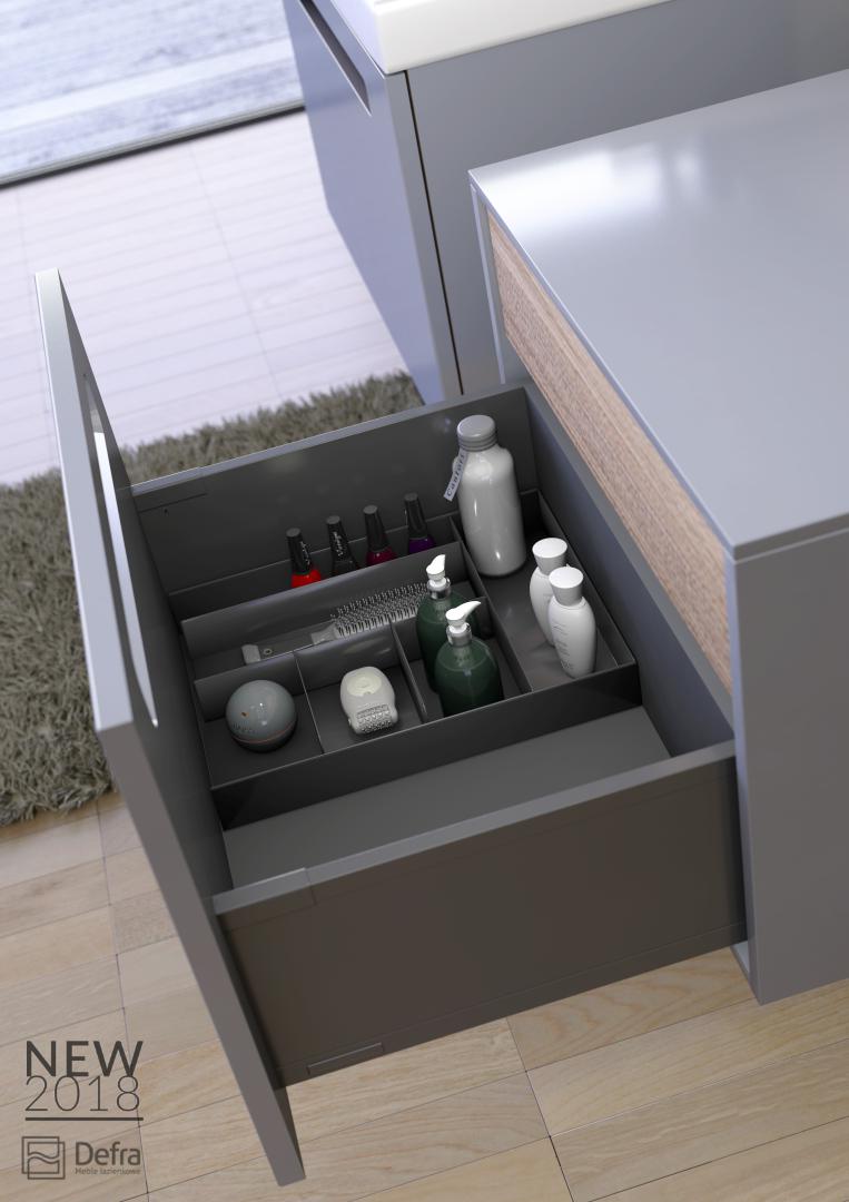 Nowe propozycje marki Defra zachwycają nowatorskim podejściem do mebli łazienkowych. Głębokie szuflady i szuflady wewnętrzne w szafkach podumywalkowych w kilku wymiarach, słupki o różnych szerokościach i głębokościach, praktyczne, pojemne szafki z blatem, sprawdzą się w każdej łazience i pomogą efektownie i funkcjonalnie zaaranżować przestrzeń, a eleganckie grafitowe wykończenie wnętrz szafek, praktyczne organizery do szuflad i unikatowe, specjalnie zaprojektowane uchwyty podniosą walor estetyczny.
