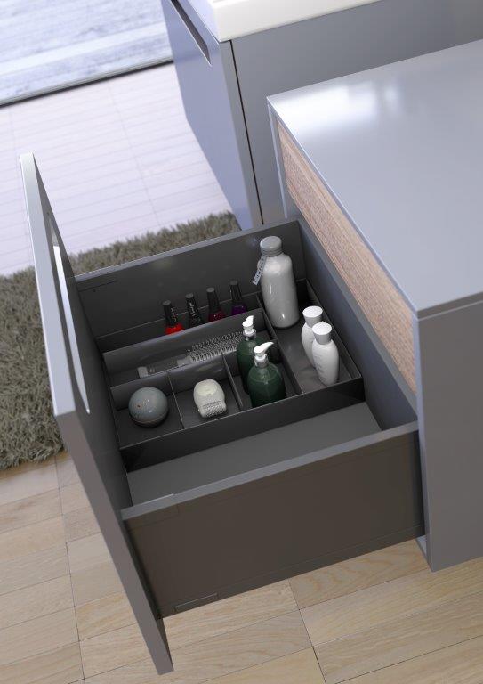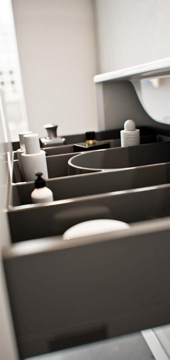 Kolekcja NODO jest jedną z nielicznych na rynku, która oferuje szafki, wyposażone w jedną, niezwykle głęboką szufladę. Zaletą tego rozwiązania jest z pewnością możliwość łatwego przechowywania kosmetyków w opakowaniach typu XXL i akcesoriów łazienkowych o znacznych gabarytach.