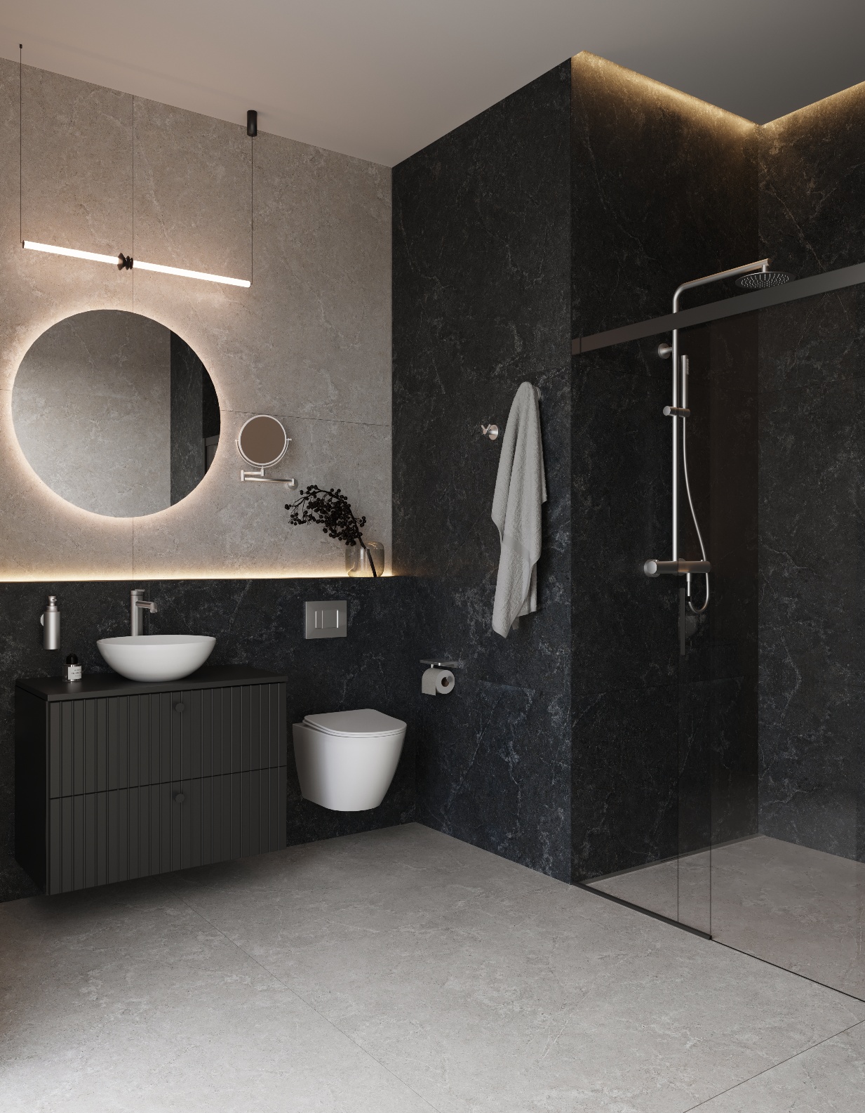 Szara ceramika to wybór dla miłośników nowoczesnych, wyrazistych aranżacji. W połączeniu z czarną armaturą, betonem lub minimalistycznym lustrem tworzy przemyślany projekt, w którym każdy element wnętrza jest na swoim miejscu. To projekt pełen charakteru, nadający łazience dynamiki.