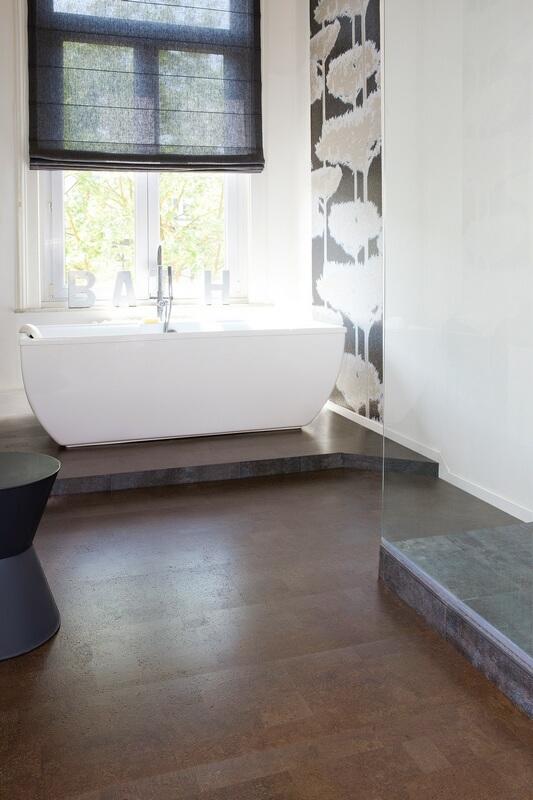Łatwe w pielęgnacji podłogi korkowe oferowane są w bogatej palecie naturalnych i barwionych wzorów. Ciekawym rozwiązaniem dla wnętrza w jasnych tonacjach mogą być ciemniejsze wybarwienia podłóg np. Identity Tea z kolekcji Identity, czy eleganckie Slate Caffe z New Collection. Transparentna farba precyzyjnie uwypukla fakturę korka, pozostawiając naturalny efekt. Podłoga korkowa może być świetną alternatywą dla zimnych kafelków z kamienia.