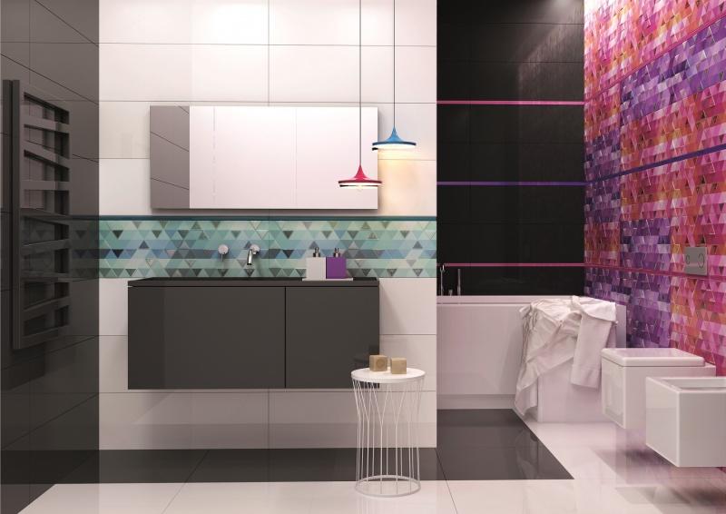 Kolekcja dekorów Opp! 90×30 jest zróżnicowana. Jedną z propozycji są dekoracje Multicolor w trzech wersjach kolorystycznych: energetyczna Fuchsia, orzeźwiający Aquamarine i intrygujący Violet. Intensywne barwy i geometryczna struktura nadają płytkom nowoczesny charakter oraz skutecznie przyciągają wzrok. Delikatne lustrzane elementy w kształcie trójkątów podkreślą efekt glamour we wnętrzu.