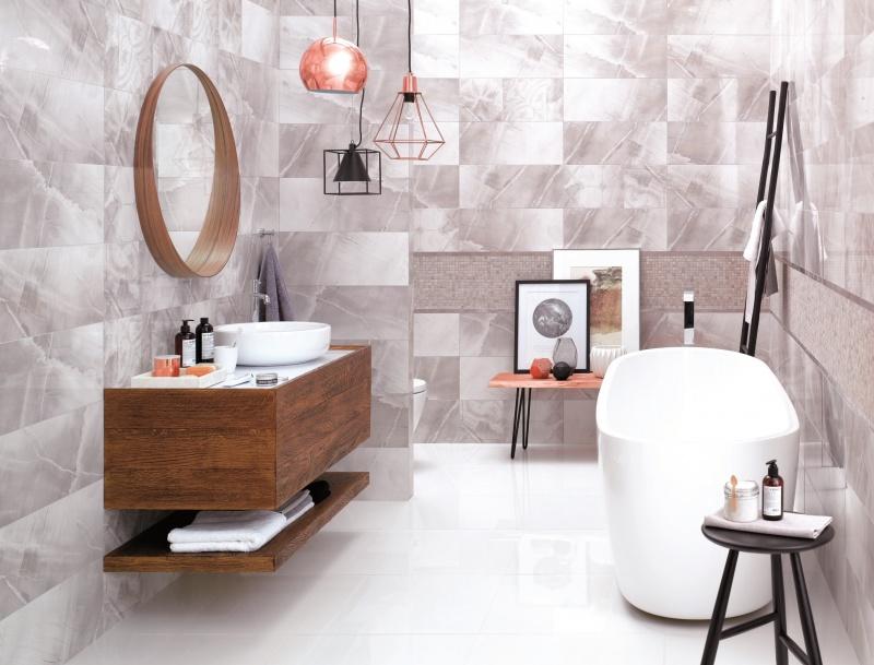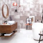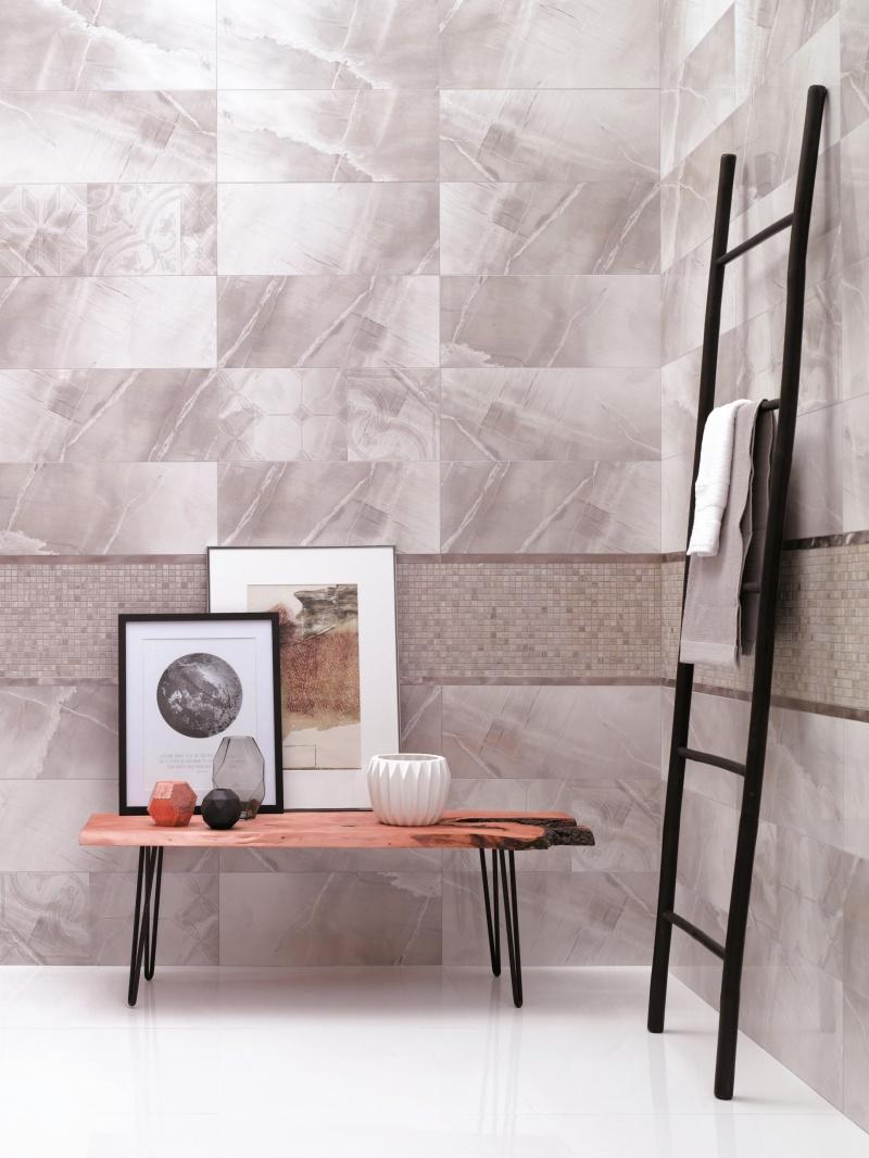 Beże, szarości i rysunek kamienia to aranżacyjne „pewniaki”, które prawdopodobnie nigdy nie wyjdą z mody. Warto urozmaicić je delikatnymi dekorami. Motyw portugalskiej mozaiki azulejo nałożony na kamienny rysunek to efektowny, a jednocześnie dyskretny akcent dekoracyjny, który pięknie komponuje się z płytkami bazowymi.