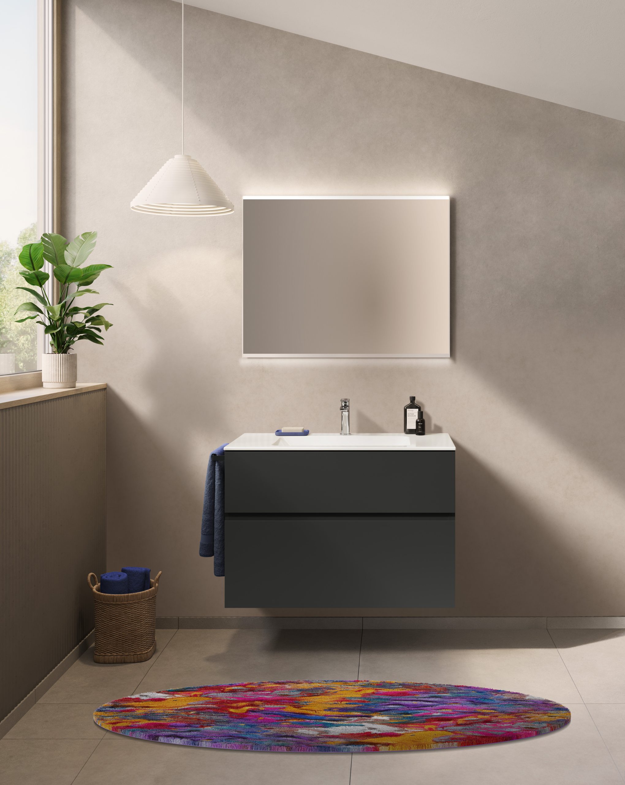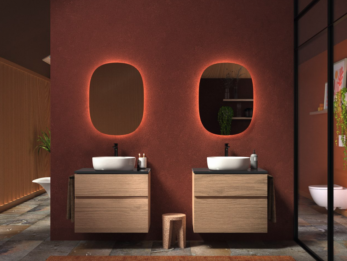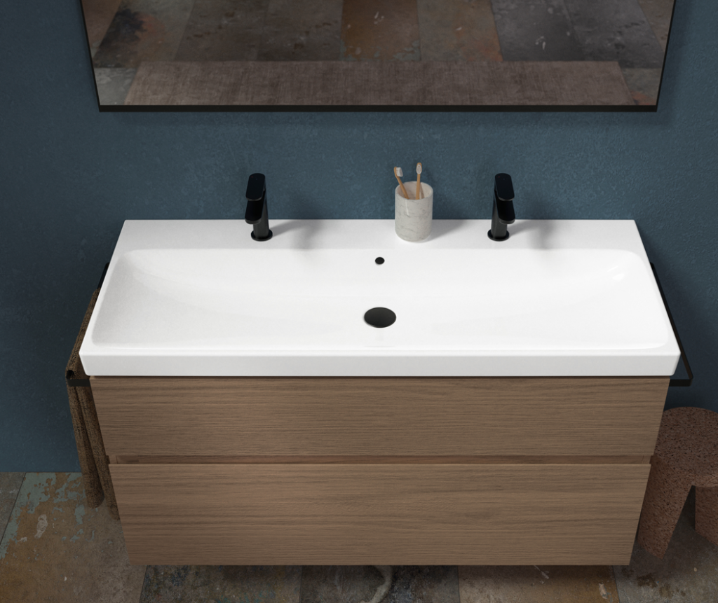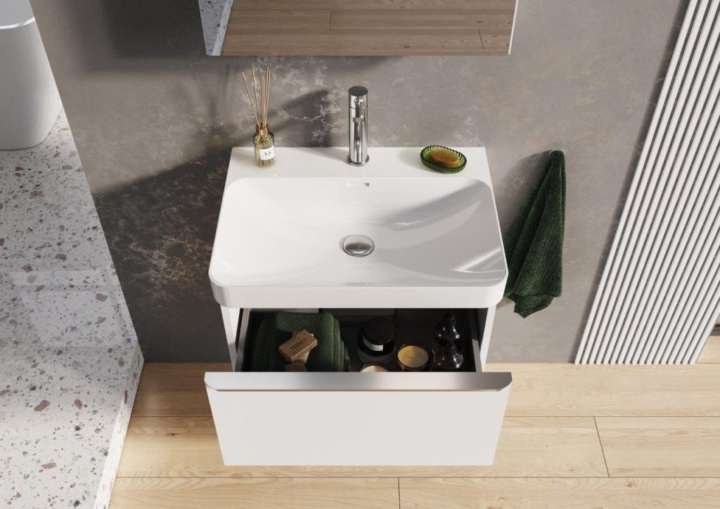 Meble Modułowe – kolor i porządek: Szafki podumywalkowe z dwiema szufladami (w szerokościach od 55 do 120 cm) i blaty do umywalek nablatowych zapewniają maksymalną przestrzeń do przechowywania. Meble dostępne są w szerokiej palecie wykończeń, takich jak: dąb o strukturze drewna oraz matowe i błyszczące lakiery w kolorach biały, lava mat czy intrygujący rusty red mat. Szuflady wyposażone są w mechanizm cichego domykania (softclosing).