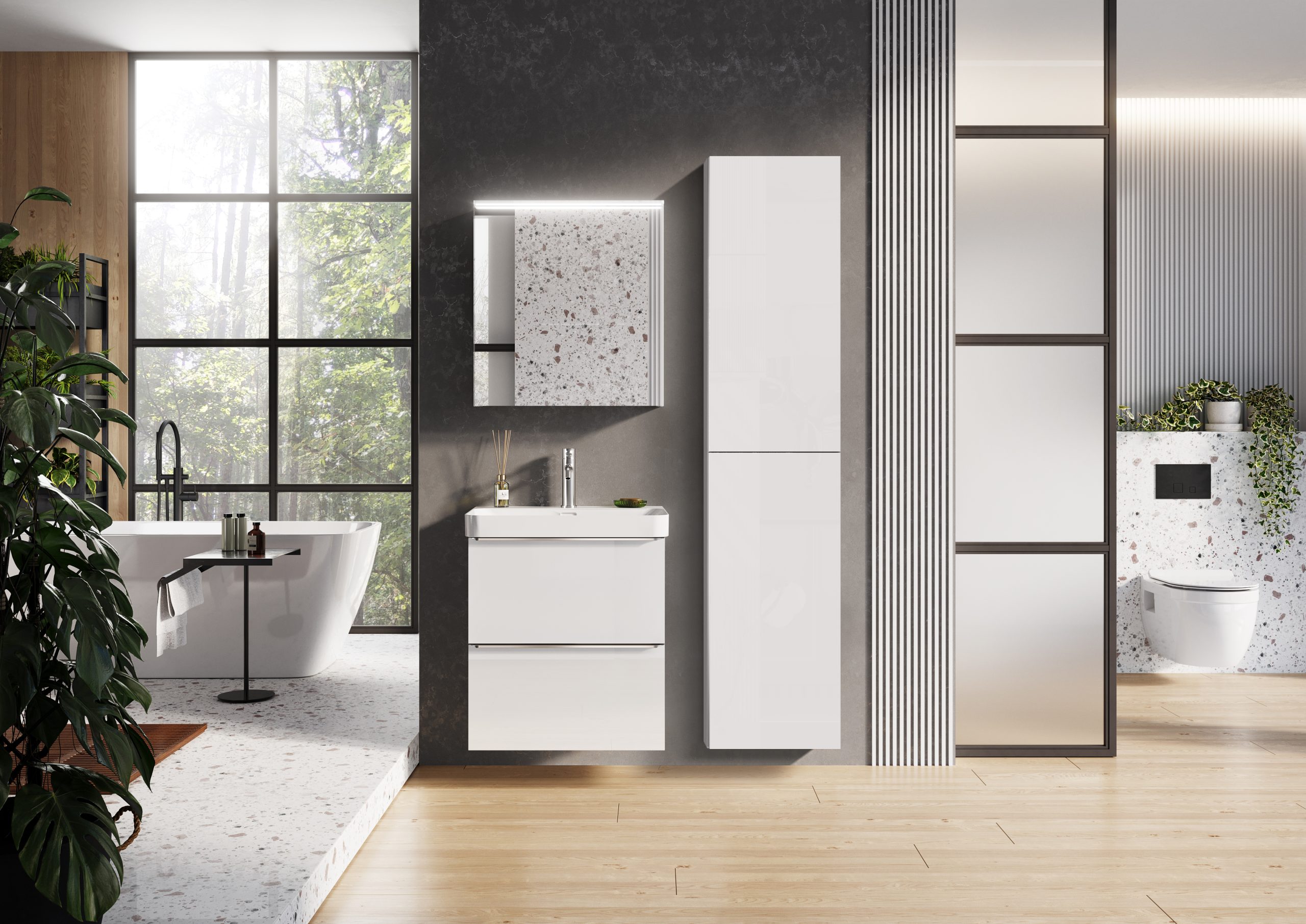 Strefa WC i bidetu – czystość i technologia: Miska WC wisząca i bidet charakteryzują się harmonijnym wzornictwem i identycznym kształtem bryły, tworząc idealny komplet. Miski WC dostępne są w wersji bezkołnierzowej Rimfree® lub z innowacyjną technologią spłukiwania TurboFlush, która gwarantuje wyjątkową czystość przy minimalnym hałasie. Całość uzupełnia deska wolnoopadająca z funkcją QuickRelease dla łatwej higieny.