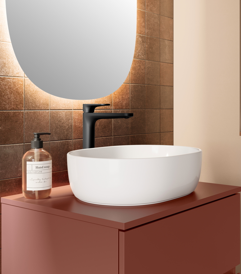 • Umywalki nablatowe o klasycznym kształcie misy, dostępne w formie okrągłej lub eliptycznej.
