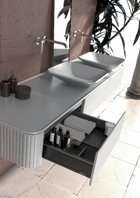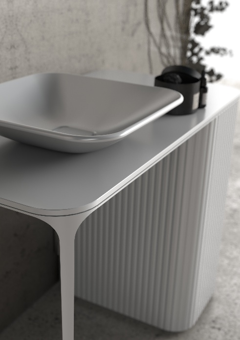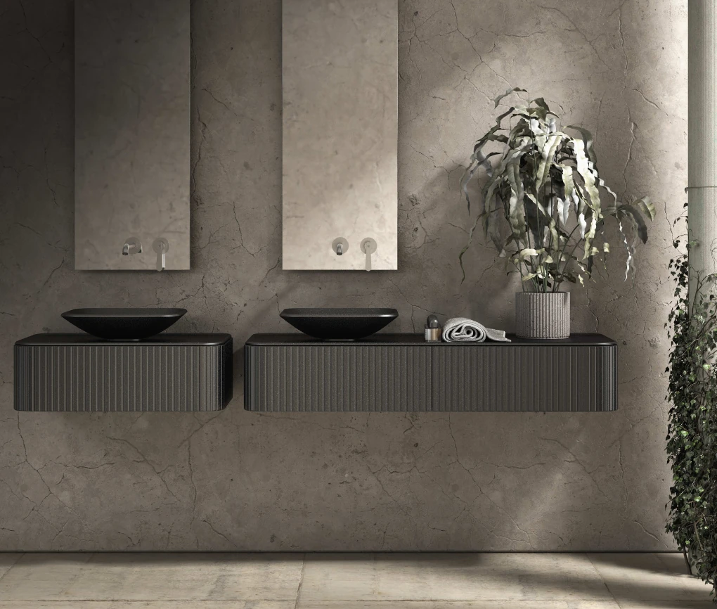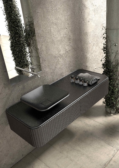 • Wnętrze i funkcjonalność: Ekskluzywność kolekcji podkreślają detale niewidoczne na pierwszy rzut oka: wnętrze szafek skrywa półki z masywnego grafitowego szkła, a szuflady w poziomych układach wyposażono w dedykowany organizer z ciemnego szkła. Dodatkowo, starannie ukryto wszystkie elementy instalacyjne – zarówno w wersji przyściennej, jak i wolnostojącej. Dedykowane blaty i umywalki zostały zaprojektowane od podstaw specjalnie dla Eterny, charakteryzując się miękko profilowanymi, ręcznie wykańczanymi krawędziami.