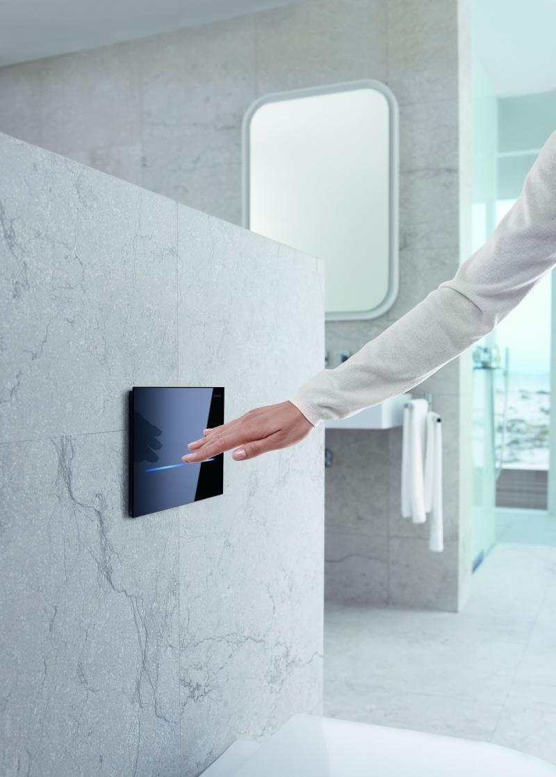 Przycisk to jedyny element spłuczki podtynkowej, który widzimy w łazience. Coraz więcej osób zauważa korzyści z możliwości bezdotykowej obsługi spłuczki. Geberit Sigma80, dzięki zastosowanej w systemie nowoczesnej technologii, może bez przeszkód spełnić oczekiwania klientów, którzy chcą higienicznie i łatwo korzystać z toalety. Produkt skierowany jest też do osób, które cenią design i lubią otaczać się technologicznymi nowościami. Przycisk Geberit Sigma80 to minimalizm, w którym główną rolę odgrywa gra światła i kolorów. Wykonany jest ze szkła czarnego lub lustrzanego z liniami światła LED.