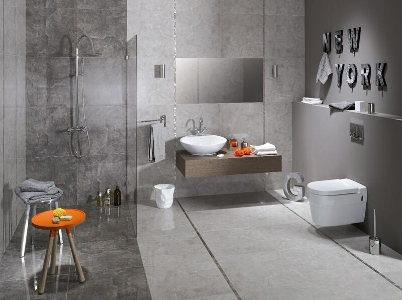 Minimalizm nie musi być nudny. Połączenie brązowego i szarego odcienia płytek pozwala na subtelne rozdzielenie strefy kąpielowej od toaletowej. Gres odwzorowujący marmur nadaje całości wysmakowanej elegancji. Dodatki w odważnym kolorze, np. pomarańczowym, oraz elementy nawiązujące do wielkomiejskiego stylu życia, jak wieszaki w kształcie liter New York, dodadzą pomieszczeniu pozytywnej energii i podkreślą jego nowoczesny charakter. Kompozycja szarości, bieli i mocnego akcentu kolorystycznego sprawdzi się w łazienkach młodych, aktywnych ludzi cieszących się życiem, a także miłośników pełnego prostoty designu.