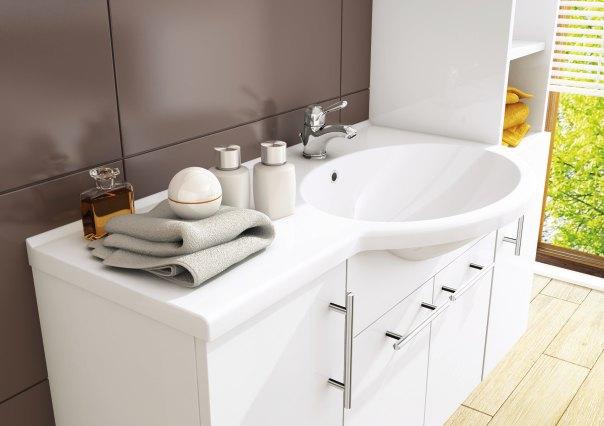 Kolekcja białych mebli Carmen to propozycja dla miłośników minimalizmu i świeżości. Gładkie meble łatwo utrzymać w czystości. Szafka podumywalkowa łączy się z asymetryczną umywalką, która tworzy jedność z białym blatem. Wymiary tej oryginalnej umywalki to: 90 cm szerokości, w połączeniu z szafką ma 55 cm wysokości i 49 cm głębokości. Dzięki asymetrycznej budowie zestawu, dodatkowa szafka pod blatem pomieści więcej przyborów toaletowych, ręczniki i środki czystości, które przechowujemy w łazience. Drzwi mebli można zamontować tak, aby otwierały się na prawą lub lewą stronę.