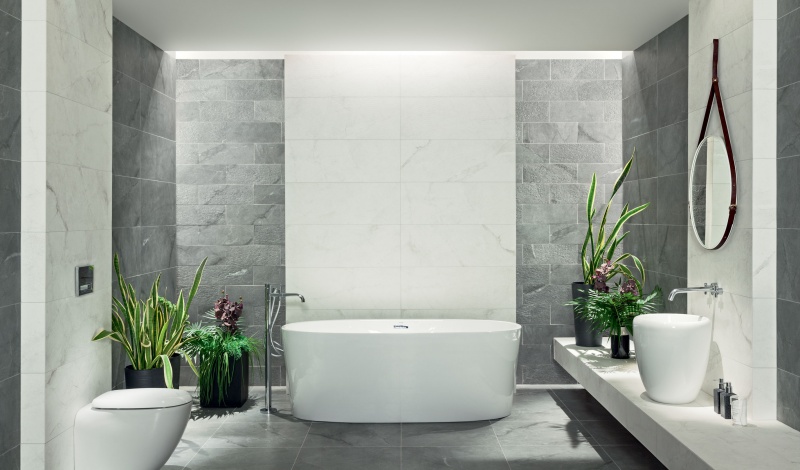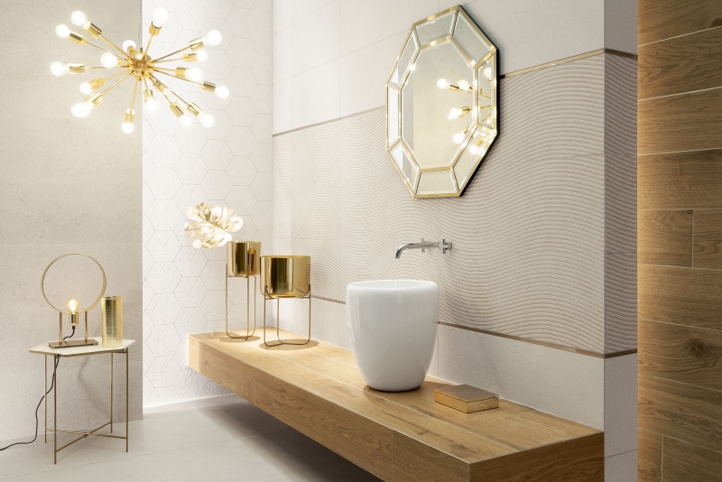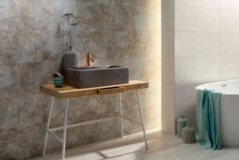 Nowy format płytek – 33×90 cm to nawiązanie do trendu wnętrzarskiego bardzo popularnego w ostatnich latach – sięganie po coraz większe rozmiary płyt, które pozwolą na użycie mniejszej ilości fug i uniknięcie efektu „poprzecinanej” przestrzeni. Dominuje harmonia i „kompletne” wnętrze, które odzwierciedla charakter właściciela domu.