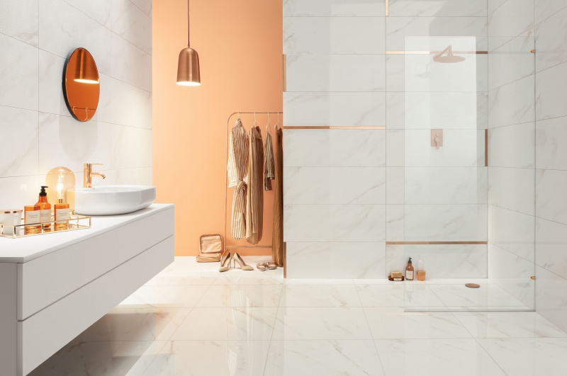 Płytki ścienne, podłogowe i dekory prezentują niezwykle modny marmur – carrarę. Ich świetnym przełamaniem jest listwa ścienna w kolorze miedzi. Błyszcząca, nienachalna, która jest „kropką nad i” całej aranżacji. Nawiązując do jej koloru doskonałym rozwiązaniem jest uzupełnienie wnętrza o dodatki w odcieniach miedzi. Tak lekkie i subtelne wnętrze z kolekcją Serenity przypadnie do gustu każdej nowoczesnej kobiecie, która ceni dobry styl i smak.