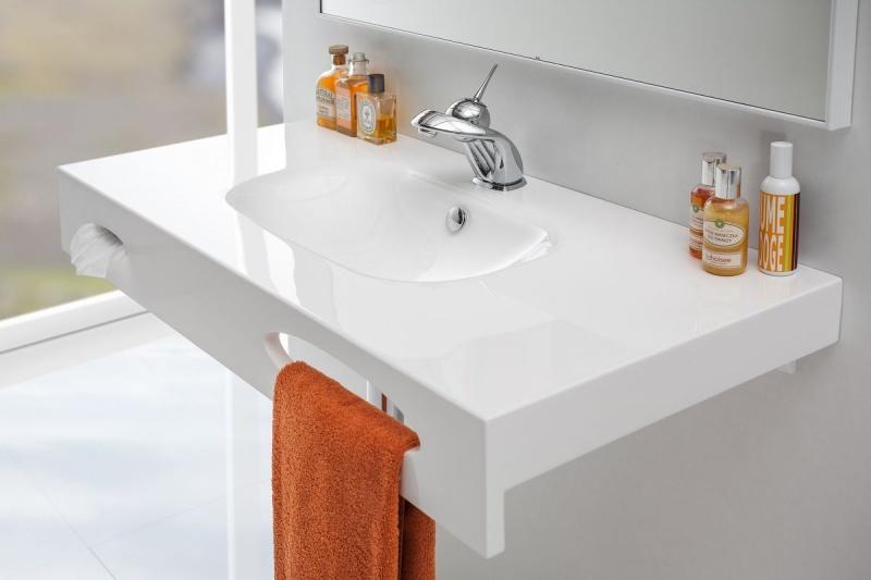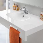 Drugim typem umywalek w rozmiarze XL są umywalki jednokomorowe z dużym blatem. To rozwiązanie może mniej funkcjonalne jeśli chodzi o równoczesne korzystanie przez całą rodzinę, ale nie mniej wygodne jeśli chodzi o zagospodarowanie łazienki (nawet tej małej). Duży blat zapewnia miejsce na odkładanie rzeczy niezbędnych np. w kąpieli – możemy na nim wygodnie położyć ręcznik, balsam do ciała, czy szlafrok. Blat, pod warunkiem dobrego oświetlenia lustra, może też pełnić rolę toaletki, miejsca przydatnego dla każdej pani domu.