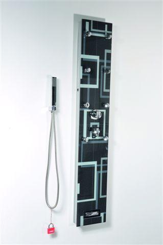 Panel prysznicowy z 8 dyszami do hydromasażu. Wykonany z czarnego szkła, z biało-szarymi graficznymi wzorami. Panel Soft Line to nowoczesny design, gdzie funkcjonalność współgra z niebanalnym wzornictwem.