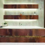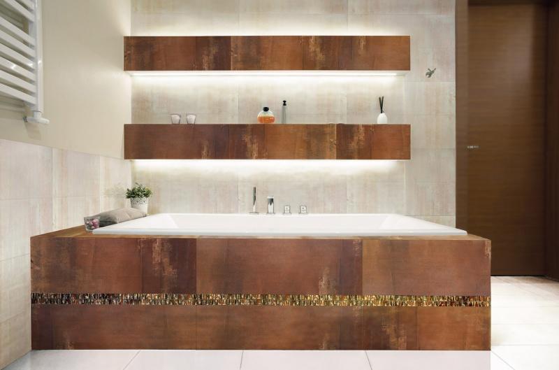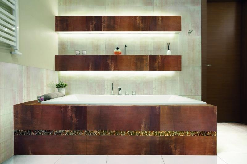 Inną propozycją dla ceniących sobie piękno malarstwa akwarelowego jest seria Ceramstic Impressive. Imponujący format 90×30 cm i ciekawy rysunek utrzymany w modnych odcieniach rudości tworzą efektowną całość, która wprowadzi do wnętrza odrobinę artyzmu, a także ociepli przestrzeń. Rdzawa kolorystyka to hit ostatnich targów płytek ceramicznych w Bolonii. Powierzchnia płytek Impressive wykończona jest w połysku, co potęguje „malarski efekt”. Glazura w dwóch wersjach kolorystycznych: Beige i Brown doskonale komponuje się z mozaiką szklaną Tesoro.