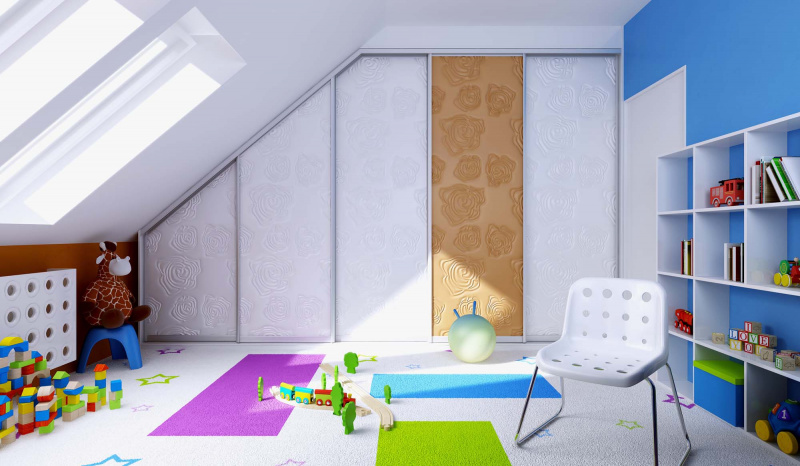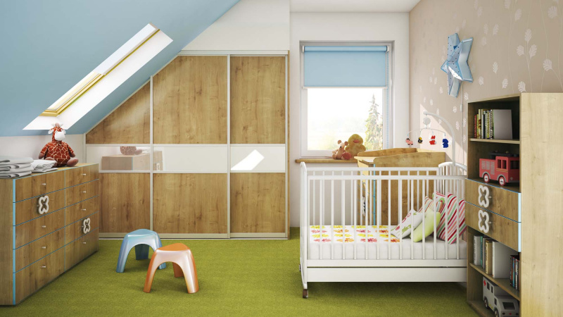Planując meble do pokoju dziecięcego trzeba cenić przestrzeń. Pokoje dziecięce zwykle nie są zbyt przestronne, dlatego nie warto ich mocno zabudowywać. Jedna duża szafa pod skosem albo w kącie powinna w pełni wystarczyć na ubrania i rzeczy używane na co dzień przez naszą pociechę. Szafa z przesuwnym frontem pozwoli wygodnie korzystać z mebla nawet w niedużym pokoju. Resztę magazynków możemy zorganizować w szafkach podwieszanych. Dzięki temu wnętrze zyska na lekkości, a dziecko – dużo więcej miejsca do zabawy na podłodze.