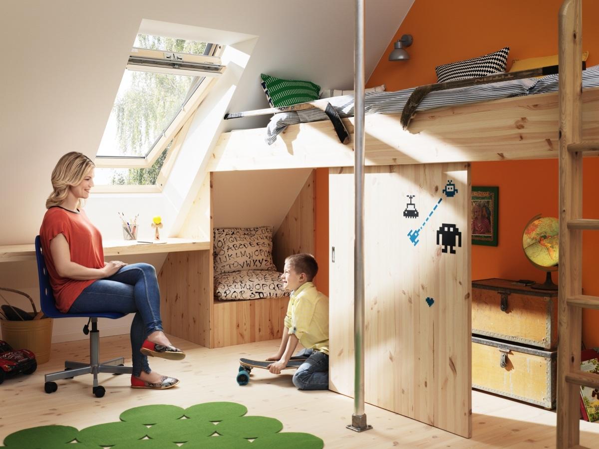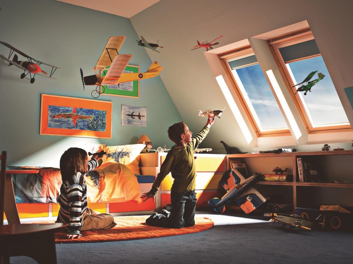 We wnętrzach na poddaszu najlepiej sprawdzają się okna dachowe, które wpuszczają do dwa razy więcej światła słonecznego niż zwykłe pionowe okna. Istotny jest także sposób ich otwierania. „Do pokoju dziecięcego polecane są modele z systemem górnego otwierania. Małe dzieci nie są w stanie sięgnąć do zamontowanego wysoko uchwytu i otworzyć okna bez pomocy rodziców” – wyjaśnia Monika Kupska-Kupis. Dla bardzo aktywnych maluchów proponowane są okna z laminowaną wewnętrzną szybą – nie uszkodzi jej np. piłka, gdy w czasie przerwy w nauce w pokoju zostanie rozegrany meczy.