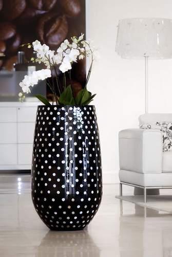 Temat motywu „grochów” jest dość złożony. Kiedyś były modne, potem trafiły do lamusa, niedawno znów wróciły do łask. Wielbicielom grochów i koneserom pięknych przedmiotów zwracamy uwagę na wazon Boyd – lekkie naczynie z włókna szklanego inkrustowane białymi grochami z macicy perłowej. Do wyboru są dwie wysokości wazonu: 55 i 80 cm.