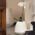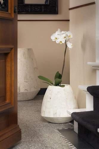 Carrera – donica w kolorze kości słoniowej jest elegancka i mocna w swojej formie. Wykonana z włókna szklanego pokrytego mozaiką trawertynową lub marmurową, dostępna jest także w innych odcieniach kamienia, m.in. słonecznego brązu i chłodnego grafitu. W kolekcji oferowane są donice o średnicy 19, 30, 34 i 50 cm oraz niezwykle efektowne wazony o wysokości 68 i 100 cm. Oprócz formy prezentowanej na zdjęciu w linii można znaleźć także naczynia o kształcie prostopadłościanu o zaokrąglonych krawędziach