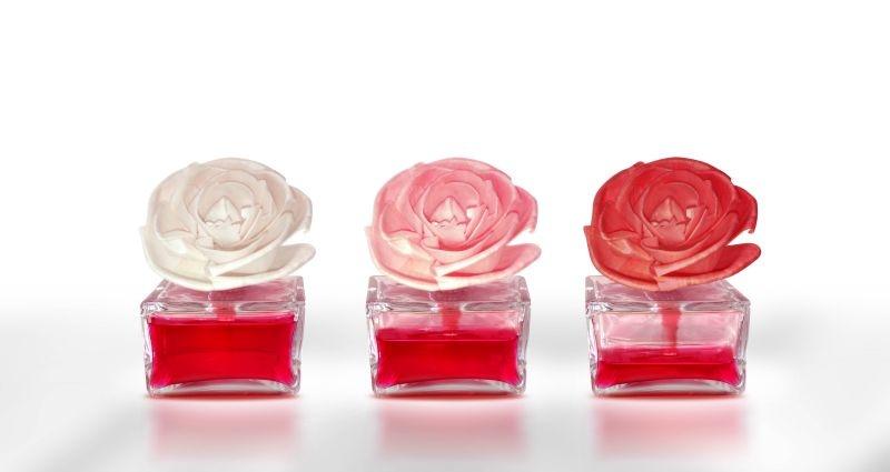 Dekoracyjny odświeżacz powietrza może przybrać formę kwiatów, których łodygi zanurzane są w szklanej buteleczce wypełnionej zabarwioną kompozycją zapachową.