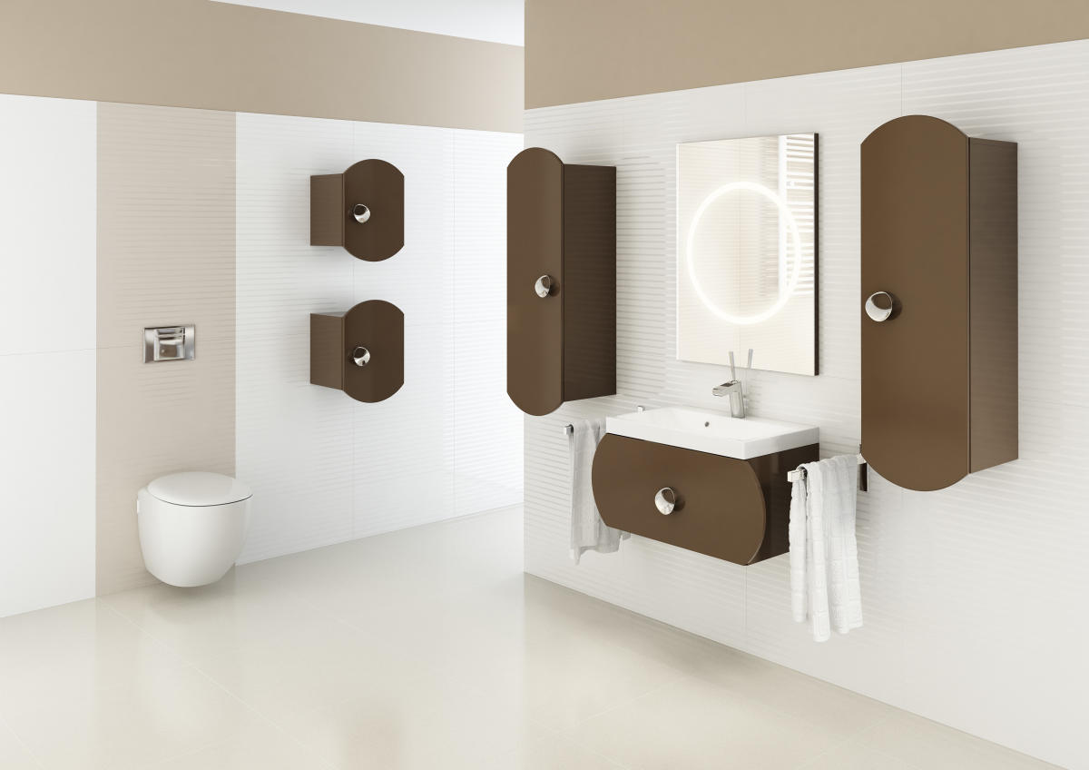 Kolekcję mebli łazienkowych INTORNO wyróżnia przede wszystkim nietypowa forma oraz modna paleta kolorów obejmująca biel, brąz i cappuccino połysk. Owalny kształt frontów uzupełniony detalem w postaci oryginalnego uchwytu wyróżnia INTORNO spośród innych propozycji wyposażenia łazienek na polskim rynku.