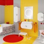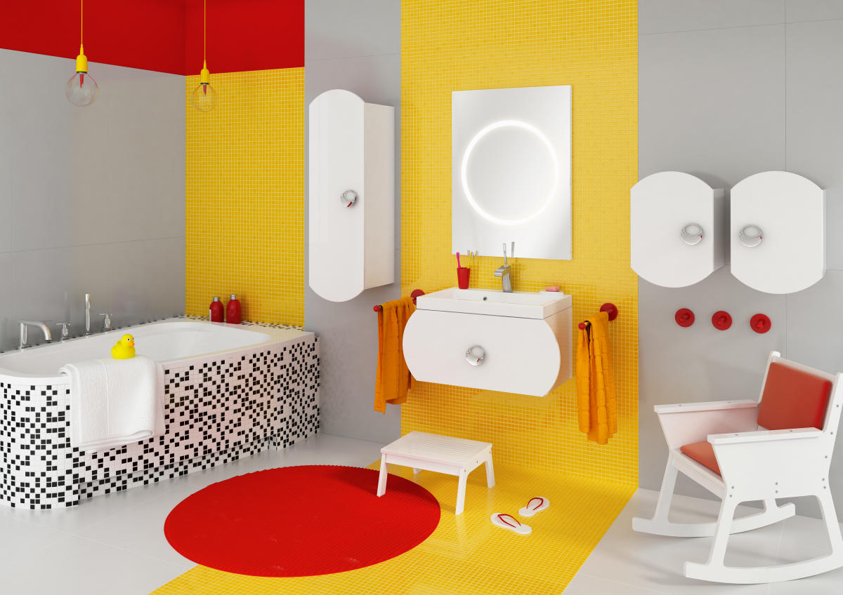 Meblami INTORNO możemy z powodzeniem urządzić również łazienkę dla najmłodszych. Kompozycja szafek o obłym kształcie w neutralnym kolorze ze zdecydowaną kolorystyką płytek bez dekorów dedykowanych określonej grupie wiekowej oraz przemyślane dodatki, którymi można zmieniać charakter wnętrza wraz z jej dorastającym użytkownikiem, uchronią rodziców przed zbyt wczesnym remontem łazienki.