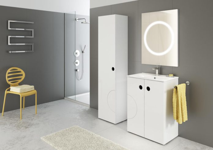 Tradycyjne uchwyty zostały zastąpione okrągłymi wycięciami, które dodają kolekcji wyrazu i podkreślają jej oryginalny charakter. Idealnie gładką i odporną na wilgoć powierzchnię w kolorze biały połysk wykonano w technologii DefraUVProtect, chroniącej przed szkodliwym wpływem promieni UV. Drzwi szafek wyposażono w komfortowy system cichego domykania – DefraSoftClose. Kubiczną bryłę szafki podumywalkowej podkreśla minimalistyczna umywalka ceramiczna SLIM z otworem na stojącą baterię. Całość kolekcji uzupełnia nowoczesne lustro INTORNO z energooszczędnym oświetleniem ledowym.