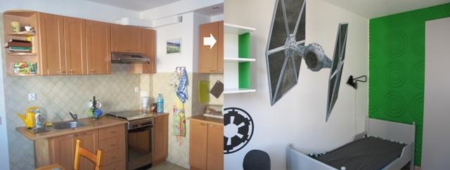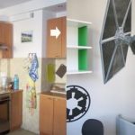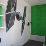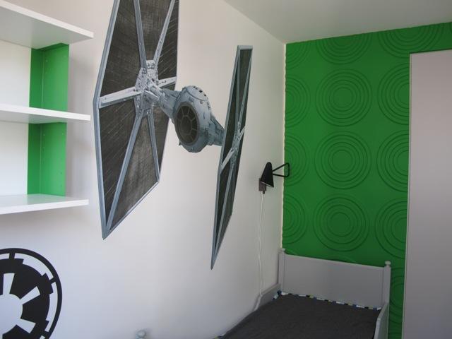 Pokój syna Małgosi również zdobi farba ceramiczna w kolorze Super White. Jedna ze ścian ma wyrazisty zielony kolor, na pozostałych znajdują się naklejki z motywami z filmu „Star Wars”. Pod oknem stanęło biurko do nauki.