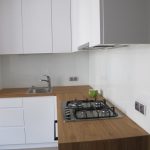 W kuchni połączonej z salonem dominuje biel, zieleń i szary. Fragmenty ścian zdobi odcień z najnowszego wzornika marki Benjamin Moore – Williamsburg. Oliwkowy kolor Parrot Green CW-465 był inspiracją przy wyborze koloru dekoracji. W bardzo zbliżonym odcieniu są poduszki, abażur nad jadalnianym stołem i doniczka na kwiaty. Bazowym kolorem we wnętrzu jest biały odcień Super White, który idealnie współgra z barwą kuchennych frontów. Wnętrze pomalowano farbą ceramiczną nowej generacji Regal Select 548, niesamowicie odporną na szorowanie i wnikanie zabrudzeń. Drewniany blat w kuchni i stół tworzą przytulny klimat.