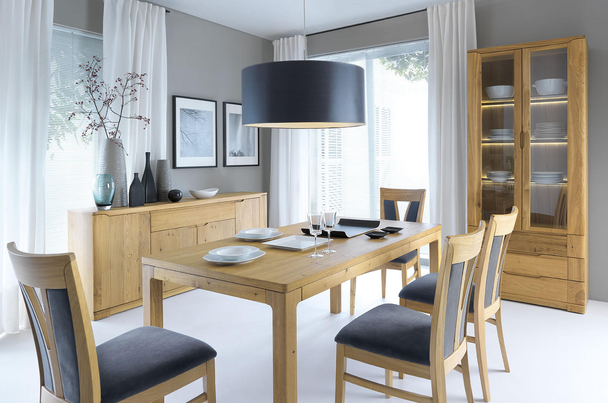 Żaden inny mebel nie jest tak uniwersalny jak stół – to on towarzyszy nam przy śniadaniu, jednoczy członków rodziny przy rodzinnym obiedzie, jest cichym świadkiem romantycznych kolacji we dwoje, a w zależności od potrzeb może stać się biurkiem, blatem kreślarskim, czy nawet stołem krawieckim. Drewniany stół z kolekcji Oleo dzięki nowoczesnemu systemowi rozkładania z łatwością rozsuniemy – mechanizm został tak skonstruowany by jedna osoba mogła samodzielnie rozsunąć blat powiększając go do potrzebnej wielkości. To mebel, który stworzono z myślą o intensywnym użytkowaniu – lakier pokrywający drewno charakteryzuje się dużą odpornością na zarysowania oraz działanie gorących i zimnych płynów, w tym alkoholu. Rozlany płyn wystarczy wytrzeć ściereczką do sucha – piękno dębowego drewna będzie nas cieszyć przez długie lata.
