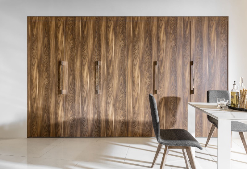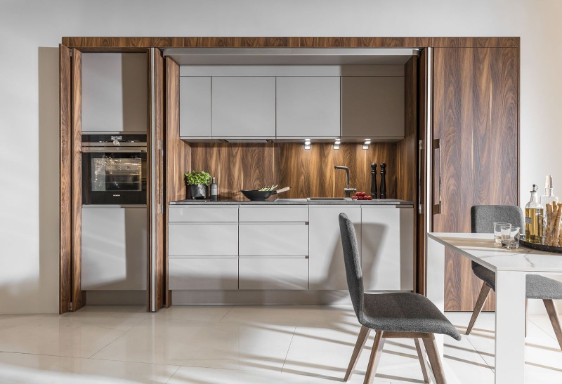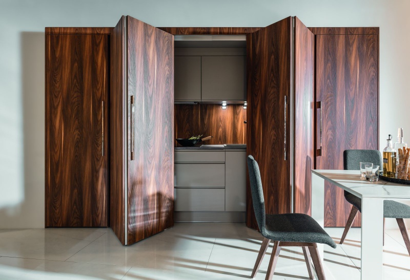 Jednym z oferowanych przez markę Peka systemów jest Hawa. Daje on możliwość ukrycia przestrzeni za drzwiami schowanymi do wnęki zbudowanej między korpusami, co nie zaburza estetyki wnętrza po otwarciu frontu. To idealna opcja ukrycia kuchni, biura czy garderoby, zwłaszcza, gdy nie chcemy, aby nasza przestrzeń była widoczna dla gości. Zamknięcie jej daje efekt naturalnej powierzchni mebla, nie zaburzając wizualnej strony ukrywanego pomieszczenia. Z kolei brak szyn w dolnej części to wygoda oraz bezpieczeństwo.