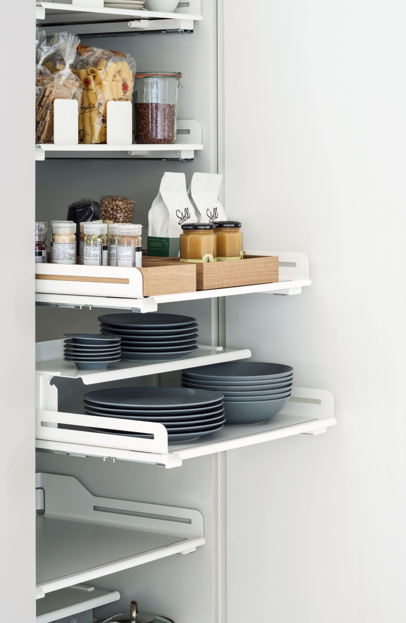 Extendo, czyli praktyczne, wygodne półki o wszechstronnym zastosowaniu użytkowania i ciekawym designie. Posiadają one ergonomiczny kształt i są wyprofilowane z jednolitej blachy, w taki sposób, by zachować wysoką sztywność. Sprawdzają się zarówno w wyposażeniu wysokich słupków w kuchni, szafek zlokalizowanych nad czy pod piekarnikiem, jak również w garderobie. Całość można dopasować do indywidualnych potrzeb użytkownika, dzięki zastosowaniu dowolnej ilości półek w dogodnych odstępach, w szafkach o różnej szerokości frontu. Dodatkowo, dno zabezpieczone jest matą antypoślizgową zapobiegającą przesuwaniu się przedmiotów podczas wysuwania i wsuwania półek. Do półek można zastosować również funkcjonalne dodatki: magnetyczne barierki , podziałki Libell czy dodatkowe nadstawiane półki, które podwyższają ich funkcjonalność i umożliwiają dostosowanie do indywidualnych potrzeb użytkownika.