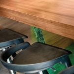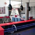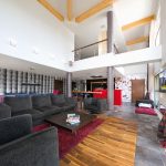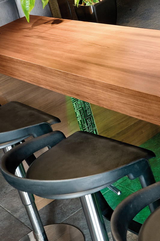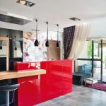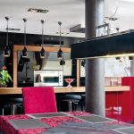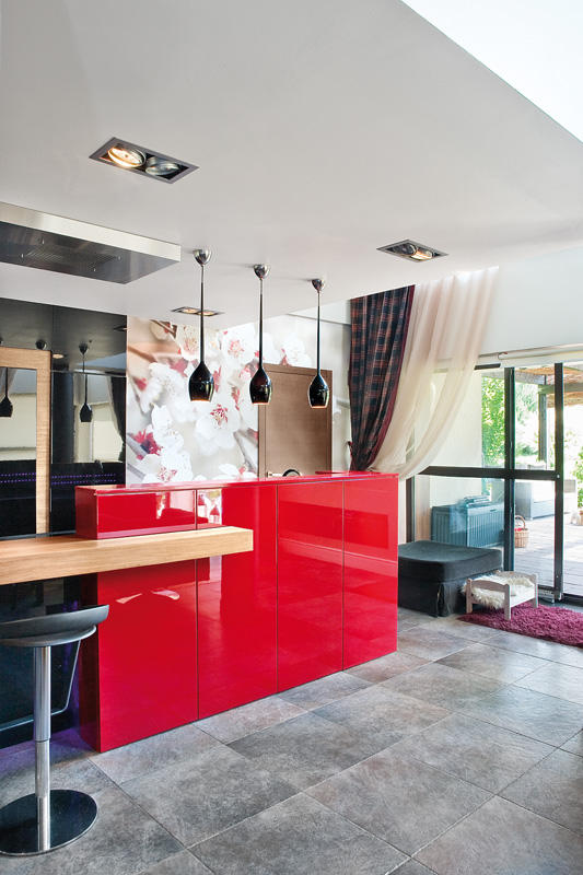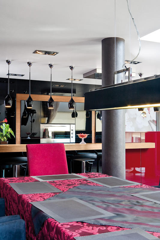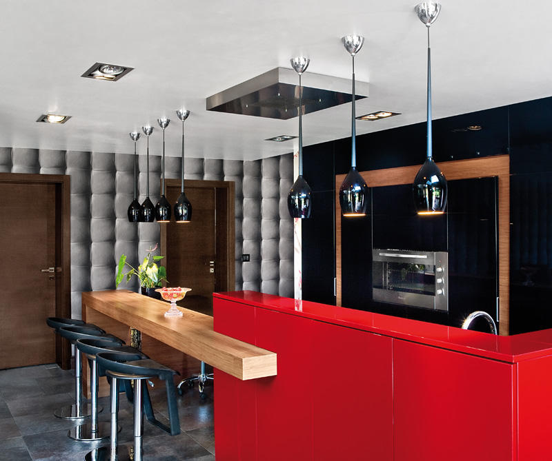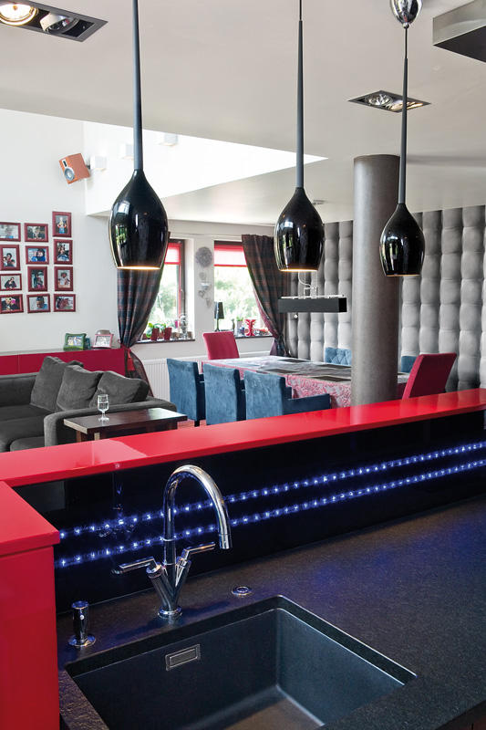 Przestrzeń kuchni stanowi właściwie tylko wyspa i szafa ze sprzętem. Wszystkie drobne urządzenia kuchenne są schowane w spiżarni ukrytej za drzwiami szafy. Ustawione na wygodnym blacie są stale dostępne do natychmiastowego użytku bez konieczności wyciągania i składania ich w całość. Tam też schowana jest zmywarka i drugi zlewozmywak. Dzięki temu rozwiązaniu w otwartej kuchni łatwo utrzymać porządek. Czarny kolor frontów w wysokim połysku zachowuje się jak lustro, powiększając w ten sposób powierzchnię. Dla zmiękczenia efektu bardzo nowoczesnej aranżacji część elementów kuchni została wykończona drewnem bete. Natomiast czerwień, bez której właściciele nie wyobrażali sobie tego wnętrza, pojawia się jako przysłowiowa kropka nad „i”. Gruby blat bufetu jest ulubionym miejscem przesiadywania zarówno domowników jak i gości.