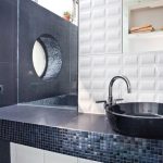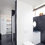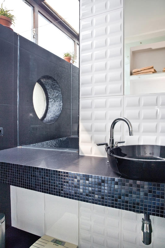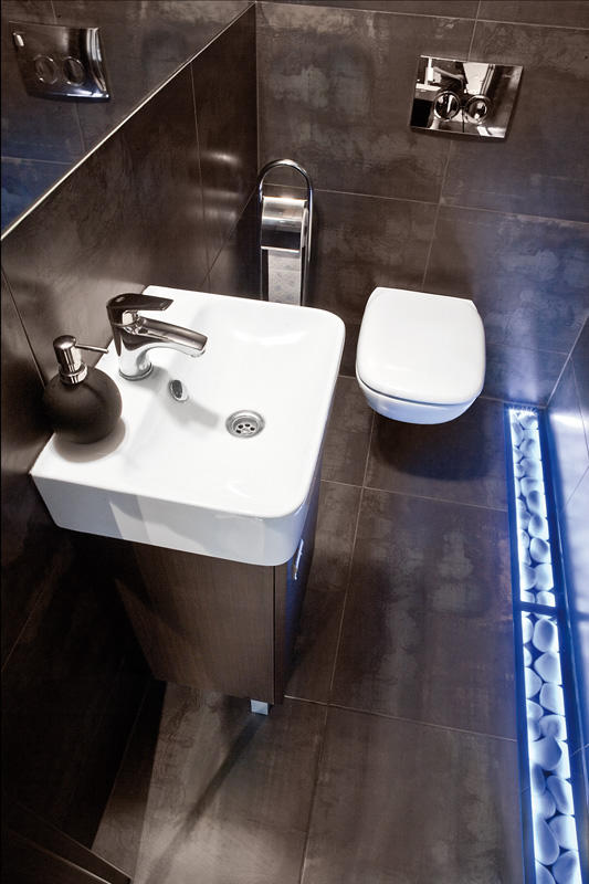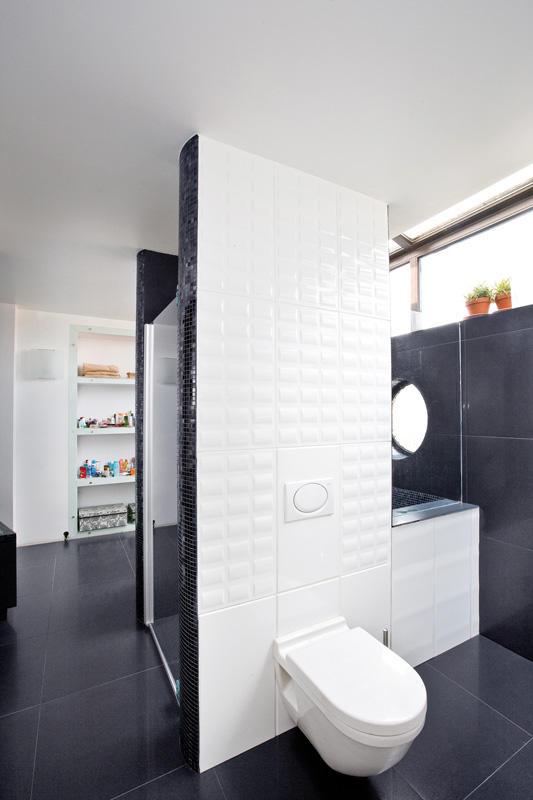 Łazienka, równie zdecydowana w kolorystyce wciąż jest w fazie wykańczania. Jej centralną część stanowi wielka kabina prysznicowa z wygodnym siedziskiem, a po obu jej stronach zamontowane są pozostałe sprzęty.