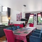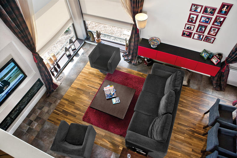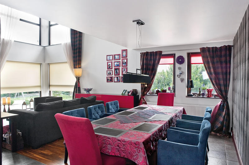 W ogólnym założeniu wnętrze miało być ostre i wyraziste, a jednocześnie stonowane i przytulne. Kolorystyka ciemna, ale nie przytłaczająca. Kuchnia, będąca pierwszym planem domu i nie oddzielona od jego pozostałej części nawet najmniejszą ścianką, decyduje o kolorystyce i formie całej przestrzeni. Miękka kanapa i wielki stół zapraszają do wspólnego spędzania czasu, a fotele zamiast krzeseł przy stole są obietnicą komfortowego cieszenia się posiłkiem i rozmową podczas kolacji. Dyskretne światło buduje przyjazną atmosferę, wylewa się z różnych stron, obalając bezwzględnie teorię oświetlenia centralnego. Wielkie okna, prawie pozbawione dekoracji, wprowadzają do wnętrza promienie słońca i mnóstwo zieleni. W zasadzie nigdzie nie ma niepotrzebnych sprzętów i bibelotów. Jedyny wyjątek stanowi stale rozbudowywana galeria zdjęć i dekoracje, ustawione tuż przy dwóch mniejszych oknach, zainspirowane szwedzką tradycją ustawiania w oknie lampek i lampionów. Płomienie świec wspaniale wzbogacają wnętrze.
